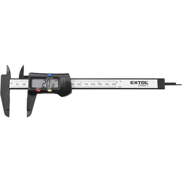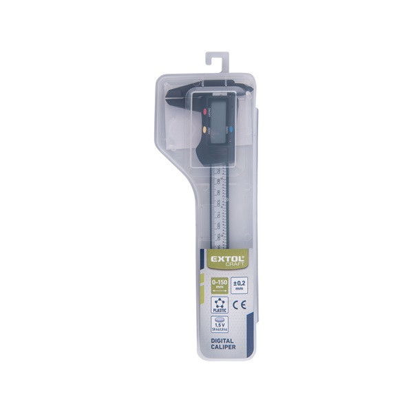 Az Extol Craft digitális tolómérő 0–150 mm-es mérési tartománnyal és LCD kijelzővel készült. A mm és inch (hüvelyk) mértékegység az átkapcsoló gombbal váltható, a tolómérő ABS műanyagból készült, és műanyag tokban csomagolva érkezik. Mélységmérővel is rendelkezik, az áramellátásról 1,5 V-os LR44H típusú elem gondoskodik.