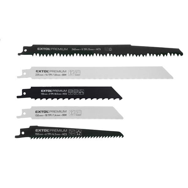 Extol szablyafűrészlap készlet (5 db) – Bosch befogás, HCS és bimetál lapok fa/műanyag/fémhez (8806000)
